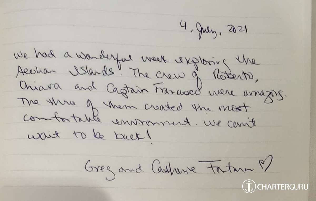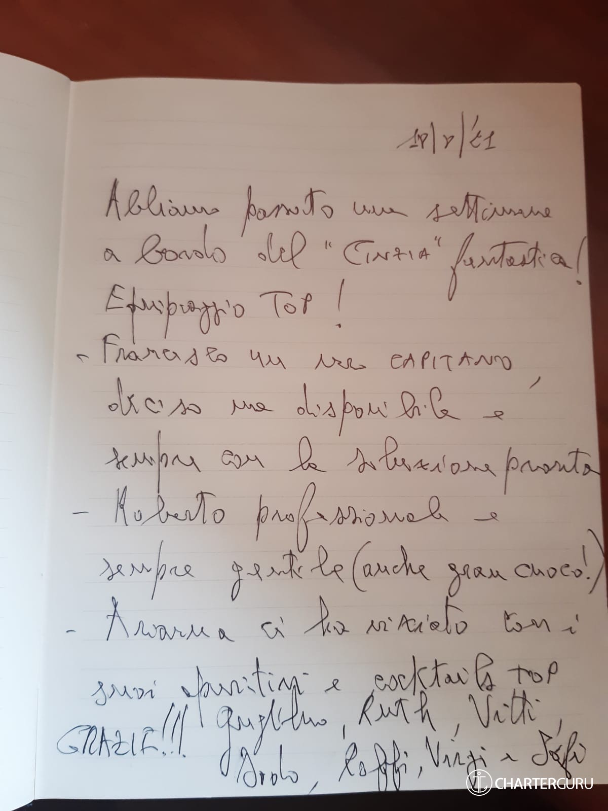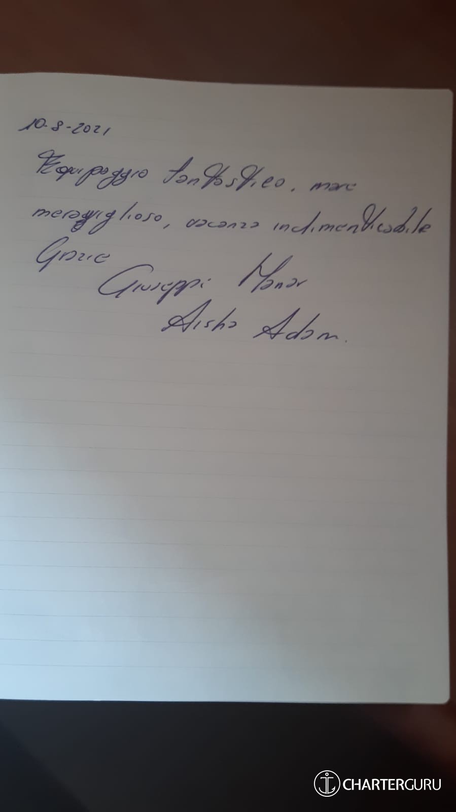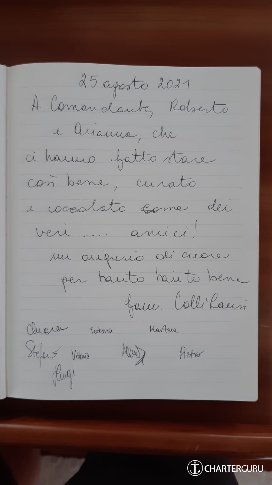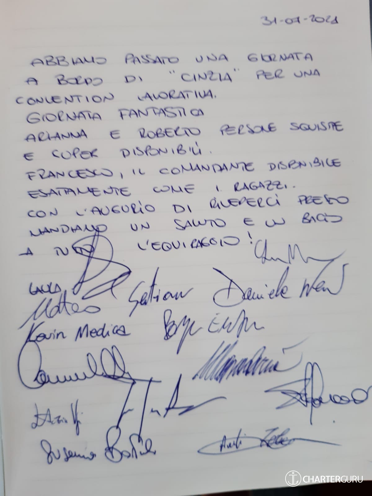 (We spent a day on board the Cinzia for a working convention. Great day. Arianna and Roberto exquisite and super helpful people. Francesco, the Commander, exactly as helpful as the boys. With the hope of seeing you again soon, we send a greeting and a kiss to all the crew!)