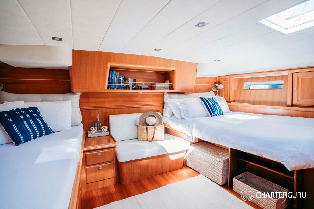 Accommodation is for up to six guests in three cabins : full-beam master suite that can accommodate two adults separately (queen and a single berth), a double cabin and twin cabin (pullman berths).What is the cabin arrangement of LA VIDELLE?