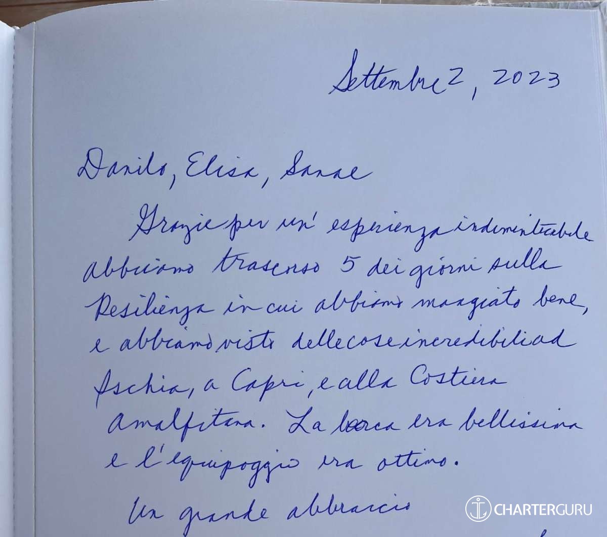 Danilo, Elisa, Sanae, Grazie per un'esperienza indimenticabile, abbiamo trascorso 5 giorni su Resilience in cui abbiamo mangiato bene e abbiamo visto delle cose incredibili ad Ischia, Capri e Costiera Amalfitana. La barca bellissima ed equipaggio ottimo! Un grande abbraccio!!