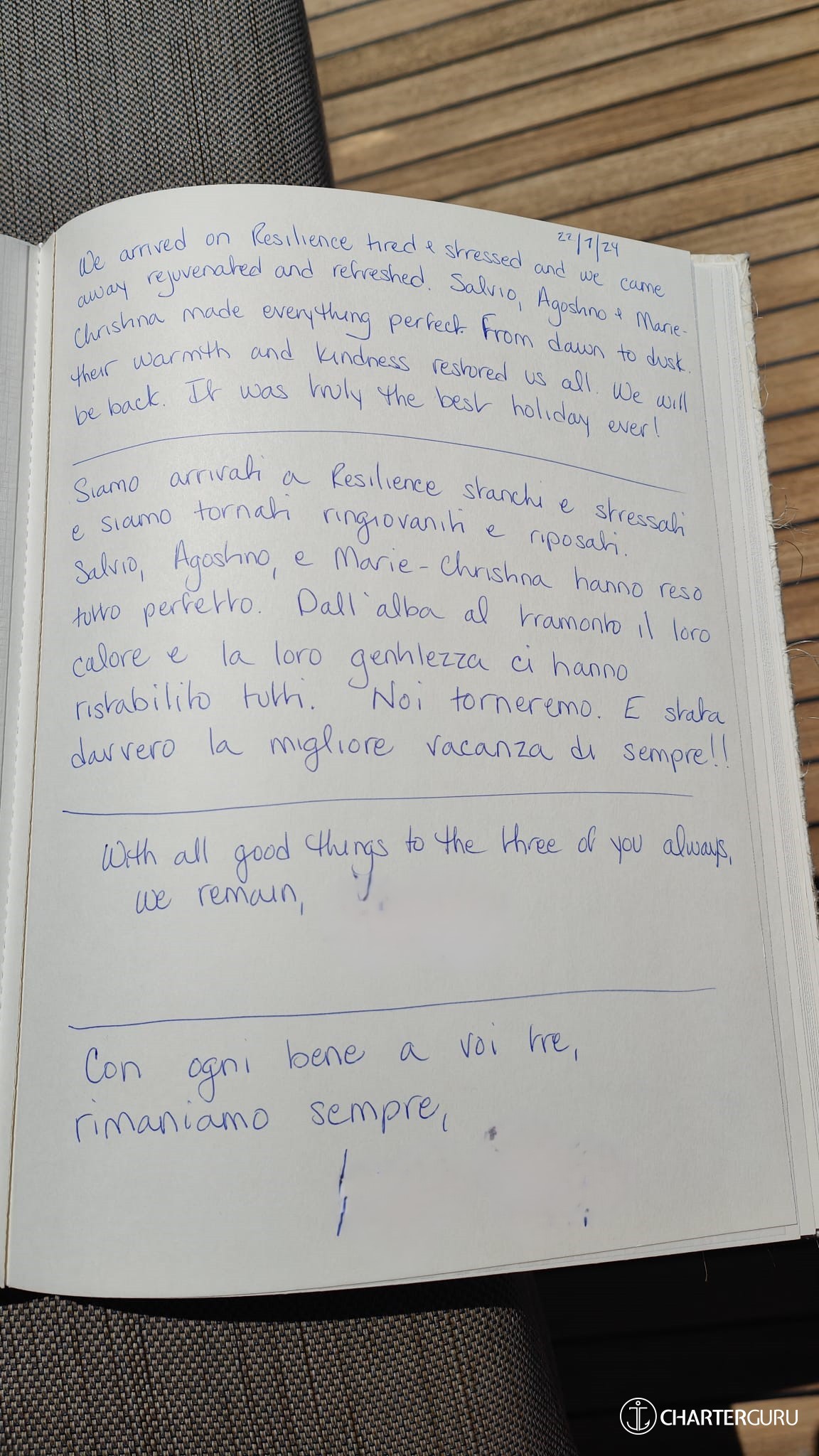 We can’t thank you enough for the most fabulous 5 days aboard Resilience. Captain thank you for taking us to all the beautiful places of Amalfi Cost and for your drone videos! Agostino thank you for attending to our every need with incoming cappucinos, Kika you are an incredible master chef: nerano linguine and branzino were truly special!! We come back home full of unforgettable memories… Grazie, Grazie, Grazie Much love to you all!