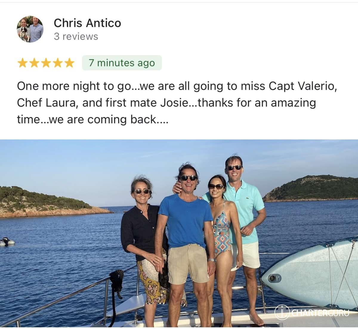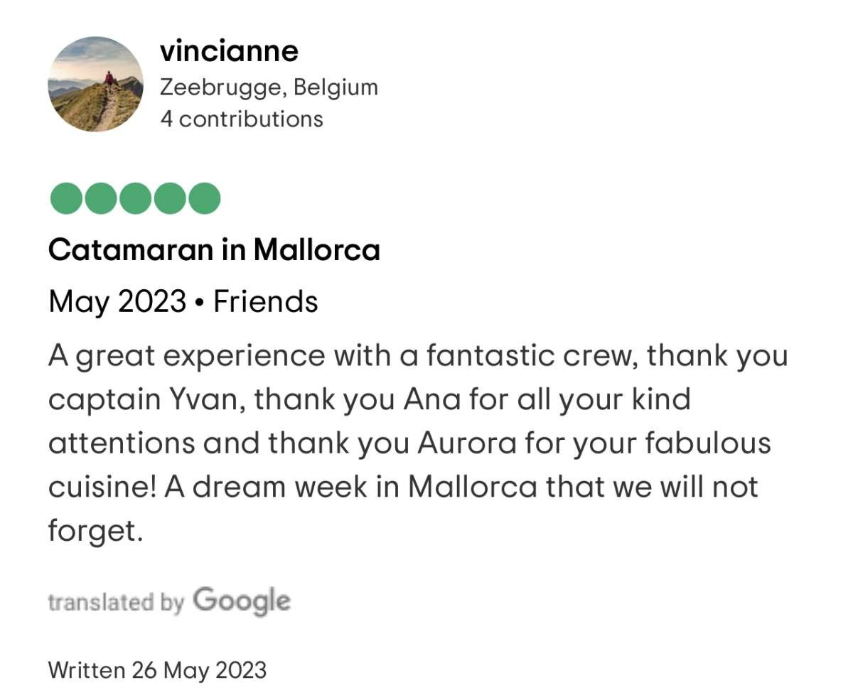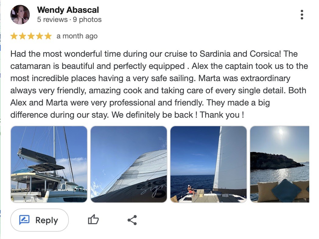 Had the most wonderful time during our cruise to Sardinia and Corsica! The catamaran is beautiful and perfectly equipped . Alex the captain took us to the most incredible places having a very safe sailing. Marta was extraordinary always very friendly, amazing cook and taking care of every single detail. Both Alex and Marta were very professional and friendly. They made a big difference during our stay. We definitely be back ! Thank you !